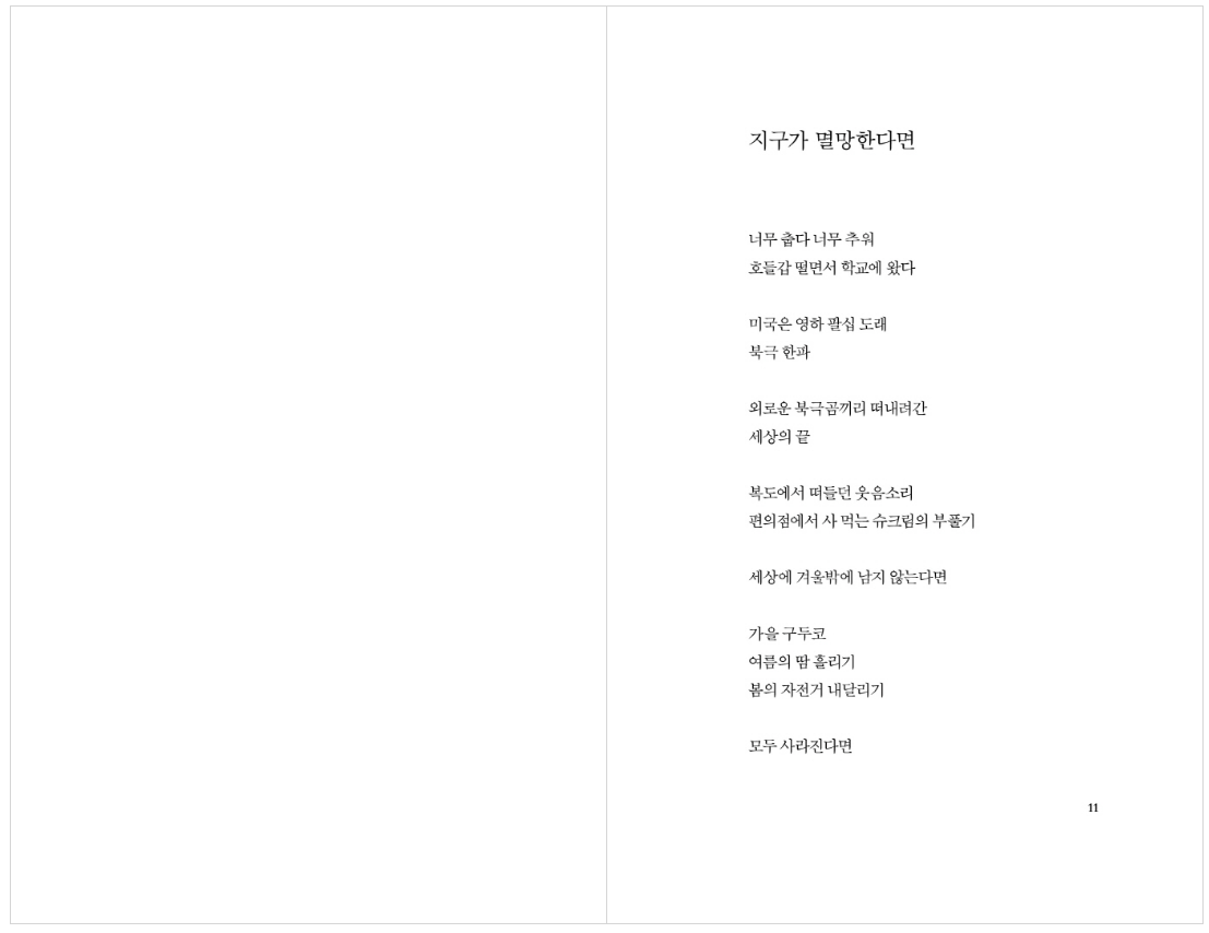 봄부터 부쩍 더워진 날씨에 ‘기후 위기’를 실감합니다. 주민현 시인의 시집 『우리가 사는 지구는 천천히 멸망 중』은 기후 위기에 대해 이야기한 시를 엮었습니다. 제목만 읽고 낙담하기엔 아직 일러요. 우리가 어쩌면 마지막 인류일지도 모르지만, 시인은 “그래도 나랑 같이 있을 거지?”라고 손을 내밀며, “미래를 상상”하자고 말을 건넵니다. 지구가 ‘멸망’한다고 ‘절망’하기보다는, ‘희망’을 향해 한 걸음 내딛자고요. 지구를, 우리의 내일을 지킬 수 있는 “작은 것들의 힘”이 담겨 있는 시집입니다.